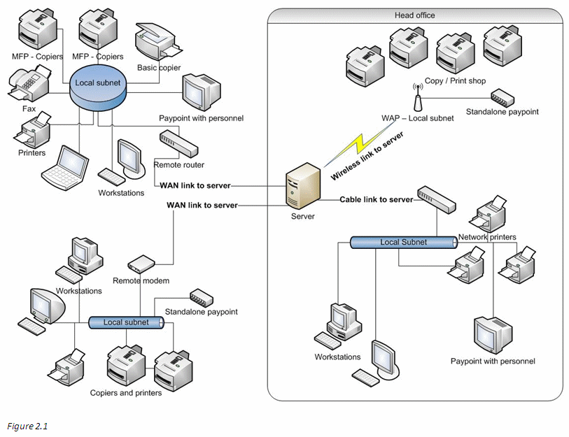 Figure 2.1 is an example of a CPrint Solutions network. In this example, the server, which keeps record of all the accounts and transactions, has multiple links to it. Some are from head office and some from other locations. At each location there is a pay point, which may consist of personnel or a standalone pay facility, which holds a replica of the server information. In the event that there is a network link failure, or for some reason the server is down, normal operations can continue at each local subnet. This ensures minimal downtime of the facilities, and speeds up processing of transactions.